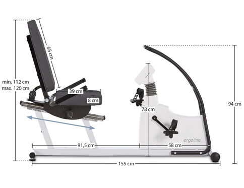 Die Sitzposition kann durch einfaches Anheben des Rasthebels in einem weiten Bereich – auch während des Sitzens – schnell und unkompliziert verstellt werden. Die hohe Rückenlehne entlastet ideal den Lenden- und Beckenbereich während des Trainings oder einer ergometrischen Untersuchung. Auch die Neigung der Rückenlehne lässt sich einstellen.